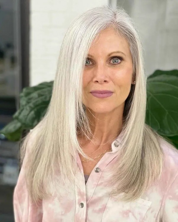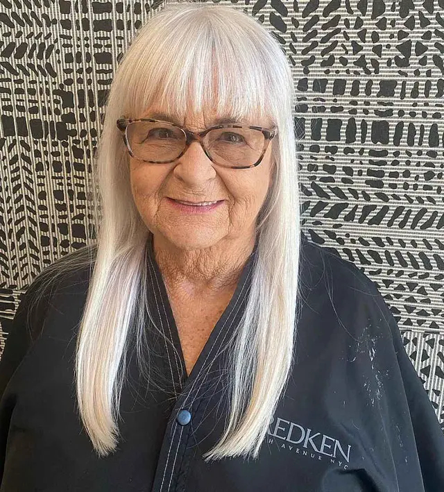 Пряма стрижка з рівним чубком для жінок старше 60 років