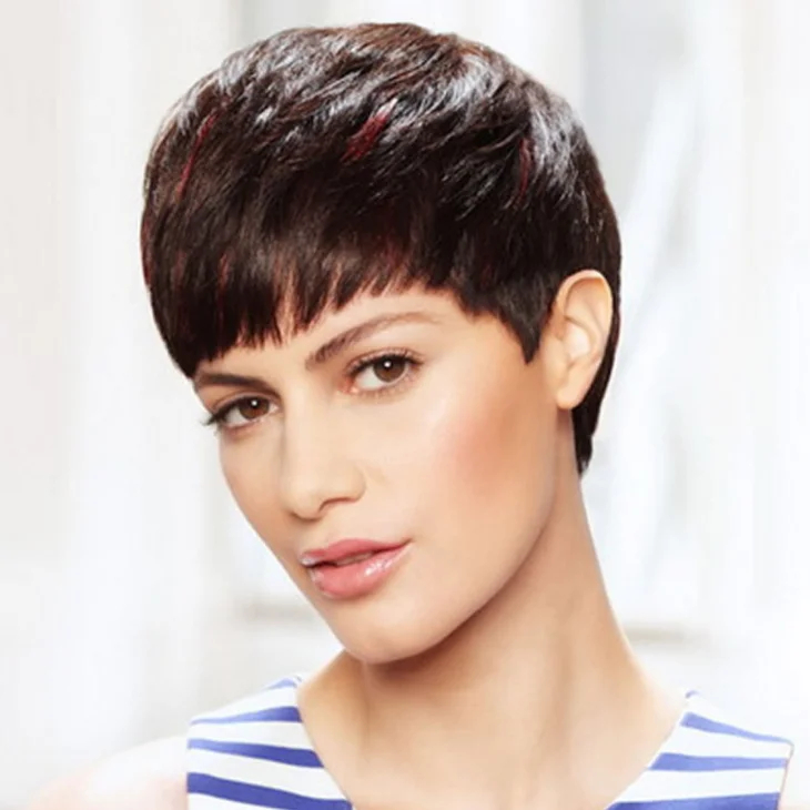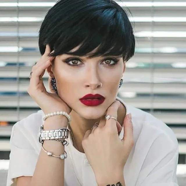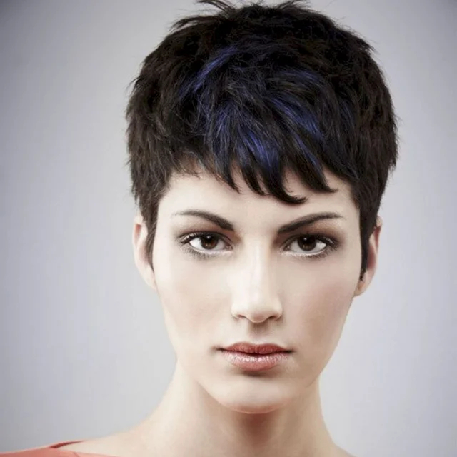 Дуже короткі чубчики в стрижках підходять жінкам з акуратними рисами обличчя.