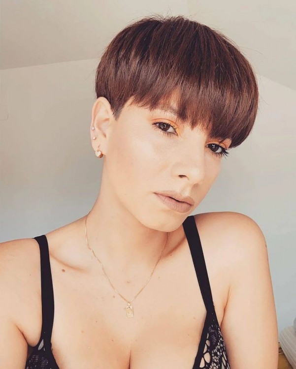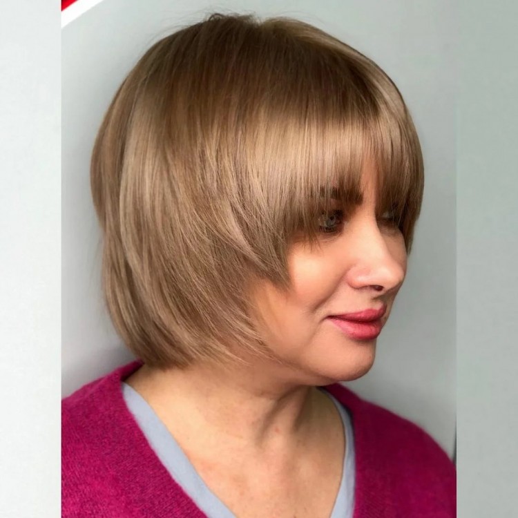 Мабуть, ця стрижка з прямим чубчиком відноситься до розряду найбільш затребуваних стрижок для жінок елегантного віку. Структурована зачіска додає зовнішності динамізму і молодості, а подовжений або рваний чубчик прикрашає образ. Така зачіска добре виглядає на жінках з будь-яким типом обличчя та волоссям.
