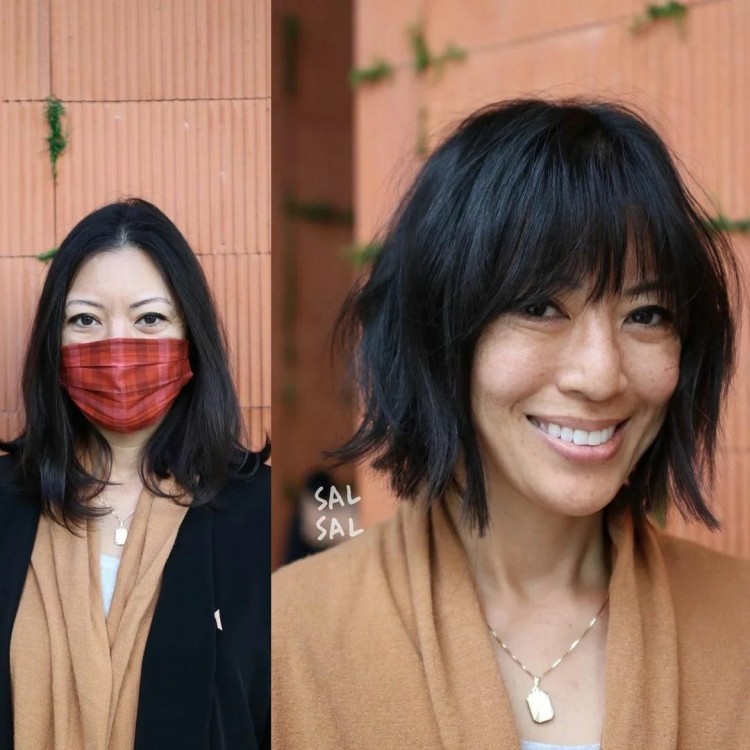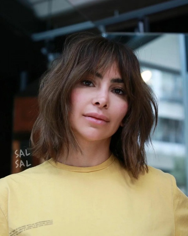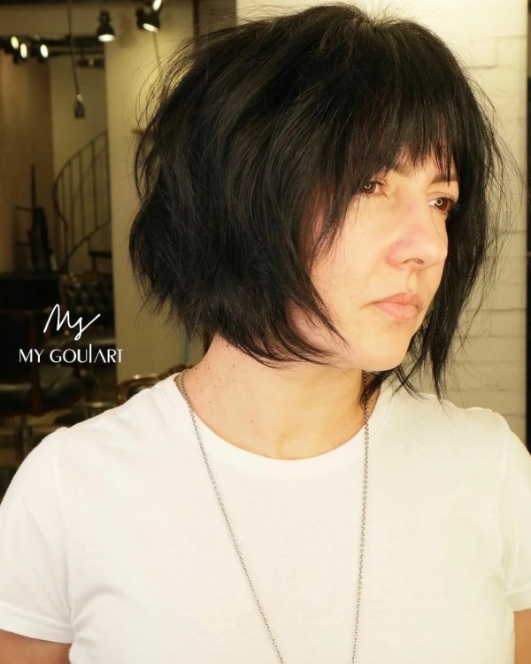 На прямому волоссі ідеально виглядає стрижка боб з косим чубчиком, яка надає образу жіночності та ніжності. М’які недбалі шари пасом, подовжених до лінії підборіддя, візуально подовжують овал обличчя, що не є зайвим для зрілої жінки.