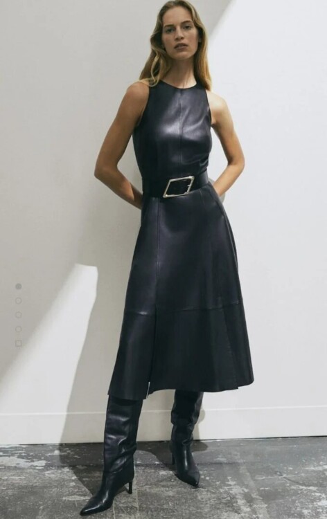 Ну і останнє на сьогодні. Куди ж без шкіри в 2020-2021. А особливо взимку! На фотографії, представленій нижче, дуже стильна та модна сукня, саме таку ми б і рекомендувала носити. Плюс пуховик / пальто / шуба.