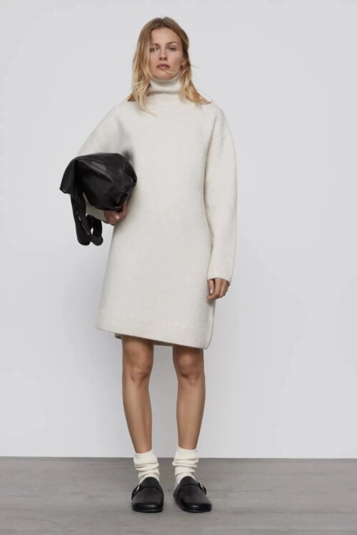 Зробити образ м’якшим і затишнішим вам допоможе тепла сукня в світлих тонах. Її можна носити як в мінімалістичних поєднаннях, так і розбавляючи наряд яскравими деталями. Головний плюс таких моделей в тому, що вони, як чистий аркуш – послужать відмінною основою для ваших модних фантазій. Великі сережки та браслети, акцентний пояс, яскраве взуття або сумочка – всі ці елементи будуть гармонійно виглядати на тлі лаконічної сукні-светру.