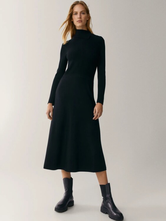 Для прихильниць жіночних образів ми знайшли лаконічну чорну сукню зі спідницею А-силуету. Головний акцент в ній зосереджений на талії – в такій моделі вона виглядає виразніше. В якості взуття сюди підійдуть як чоботи на підборах, так і черевики на грубій підошві – варіант досить «гнучкий», так що ви можете пограти з ним, як вам заманеться.