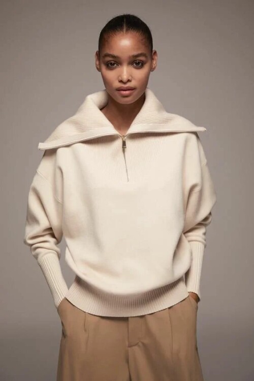Ця версія светру дуже зручна і надзвичайно приваблива. Він дозволяє фантазії експериментувати – додати кілька яскравих аксесуарів для створення романтичного стилю або пом’якшити його невимушеними легінсами і черевиками. Класичні брюки чоловічого крою і хусточка під розстебнутим коміром светра створять вдалий образ для роботи в офісі.