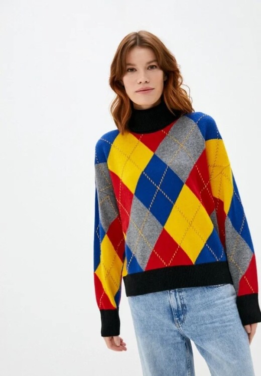 Принт клітинка не здає своїх модних позицій. Для светру доволі звичним варіантом є Аргайл. Ромби можуть бути виконані як в досить яскравих кольорах, так і припорошених, слабо контрастних з основним кольором речі.