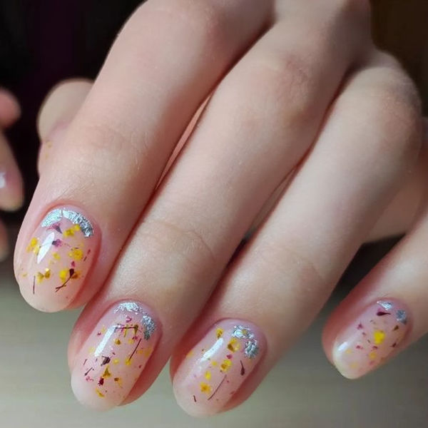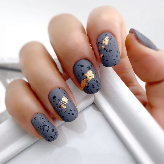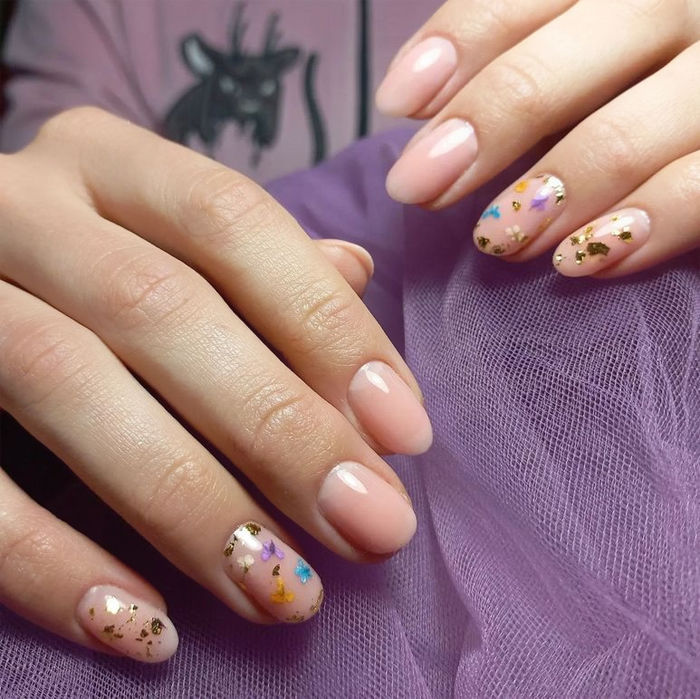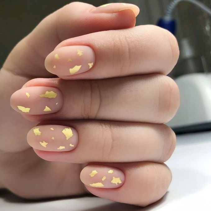 Матові шматочки металевої фольги, нанесені уривчастим способом або насипані відразу в спеціальний топ, стали модною іграшкою цього літа. Як носити? Як хочете: і як акцент, і на всіх нігтях, і як нюдову базу, і з неоном. Доречно і смачно буде все, головне, не перевантажуйте руки з поталлю кільцями, інакше виглядатиме надто химерно, в стилі «я одягну все найкраще відразу».
