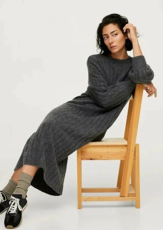 Якщо у вашому арсеналі є довге тепле пальто або пуховик, радимо прикупити собі і трикотажну сукню довжини максі. Так ви гарантовано не замерзнете взимку. Доповнити образ допоможуть щільні колготи і зручне взуття на плоскому ходу.