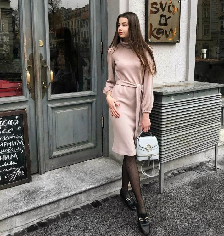 Однак, якщо доповнити її щільними колготками, високими чобітьми і стильним верхнім одягом, вийде дуже цікавий лук. Також в ролі “низу” можуть виступати легінси або джинси без декору.