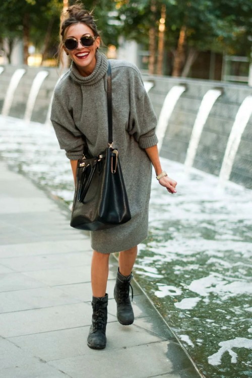 Цікава модель сукні з трикотажу, яка багато в чому нагадує кардиган. Ну або “сорочку”. Подібний ефект досягається за рахунок наявності фурнітури по всій довжині – гудзиків або блискавки. Така сукня підійде для сетів і з грубими черевиками, і з чобітьми, і з кросівками.