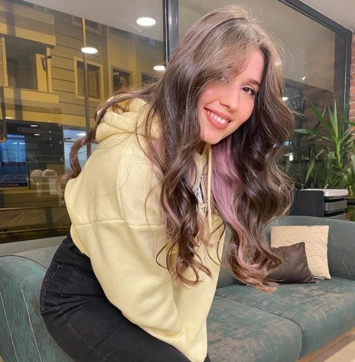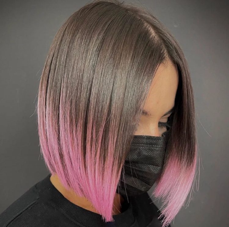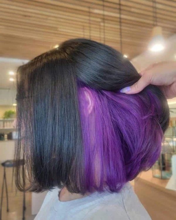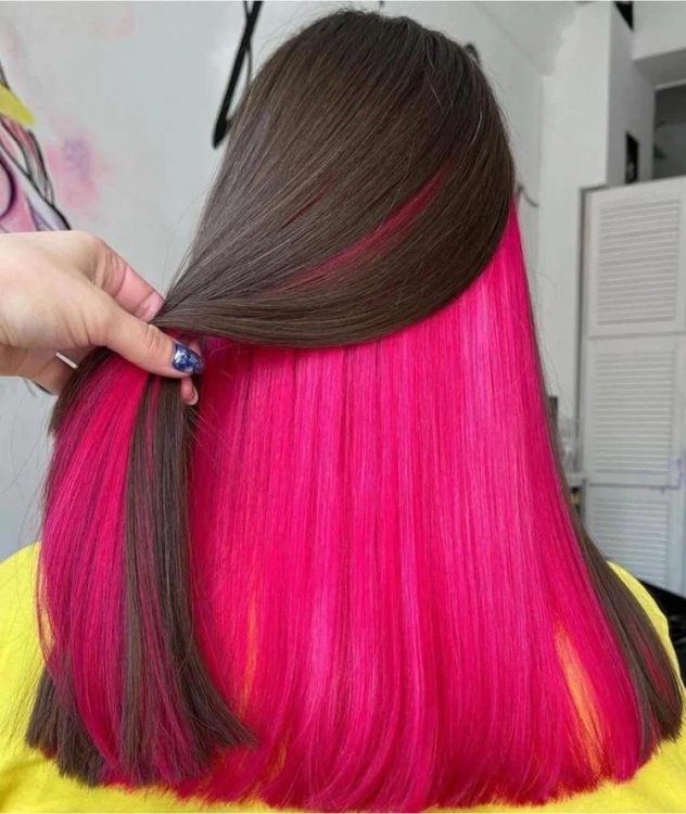 Цього сезону брюнетки охоче ховають забарвлені в яскраві або пастельні кольори пасма під свій природний відтінок. Щоб зробити нижній шар помітним, потрібно просто зібрати волосся у хвіст або змінити укладання.
