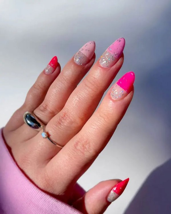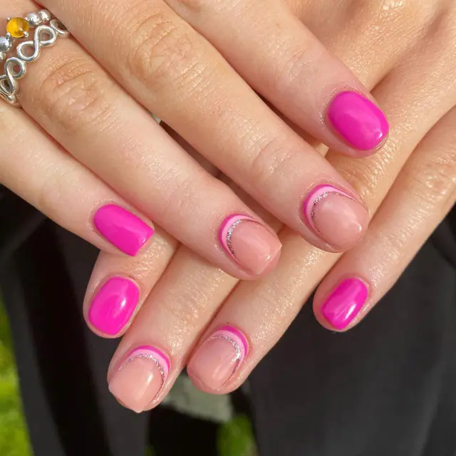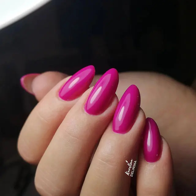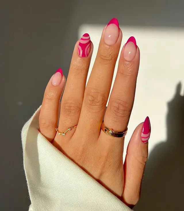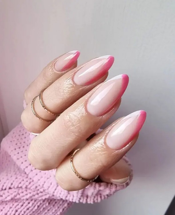 Яскравий рожевий френч на мигдальних нігтях середньої довжини