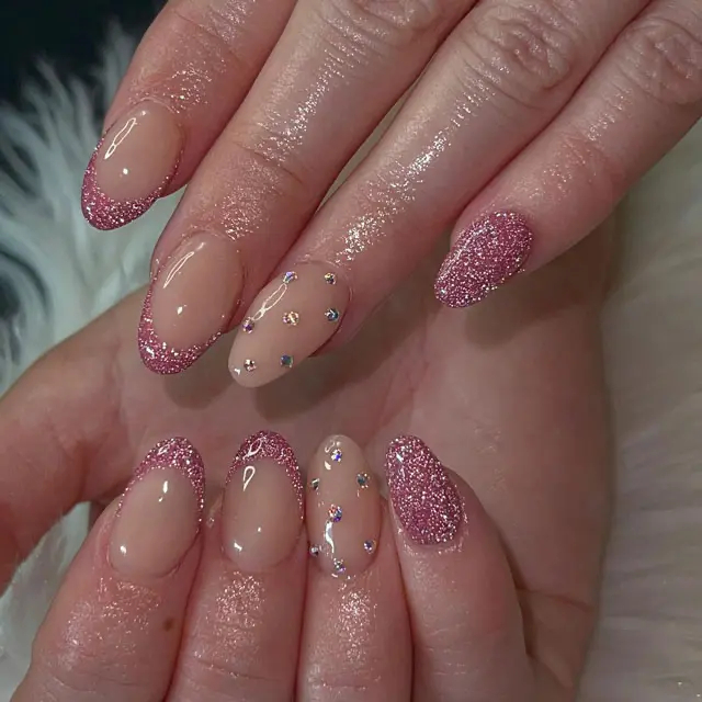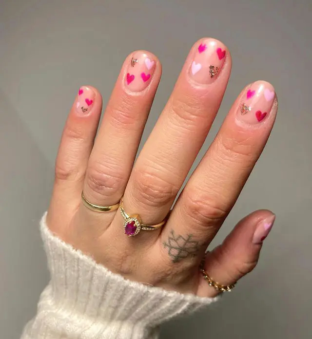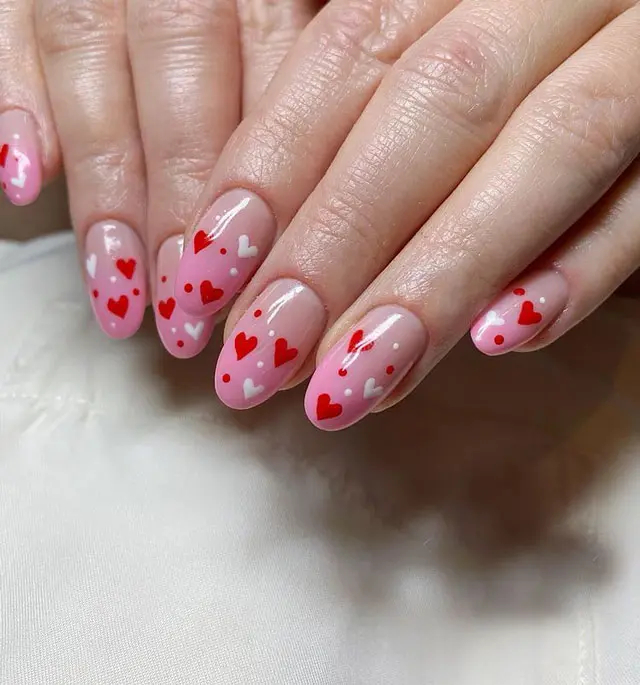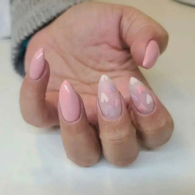 Рожевий манікюр з сердечками на овальних нігтях середньої довжини