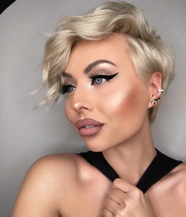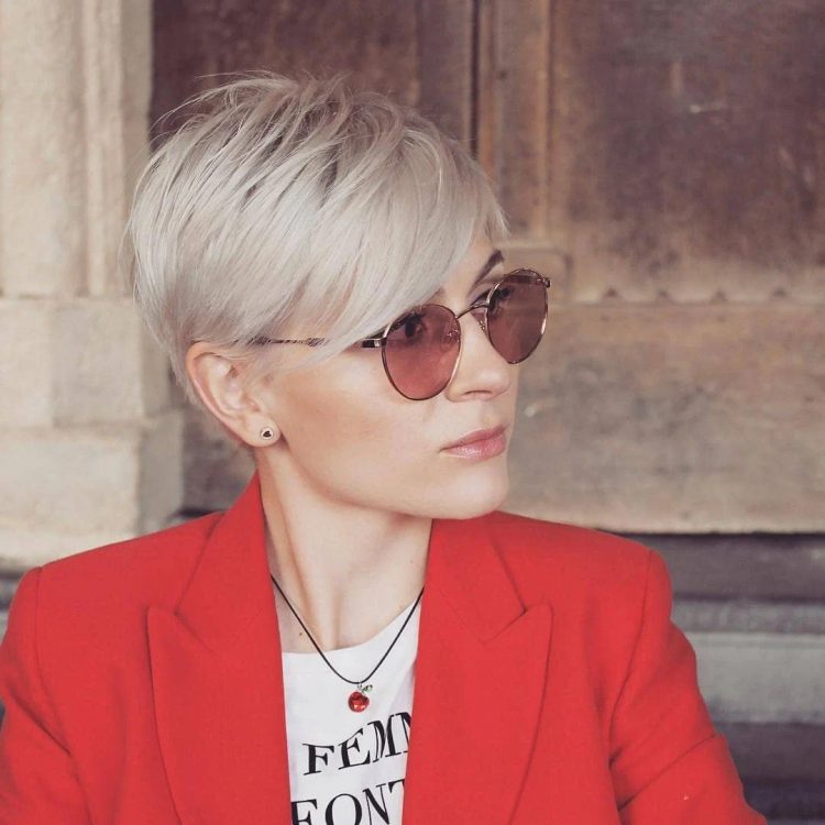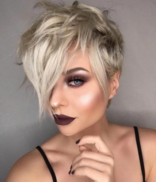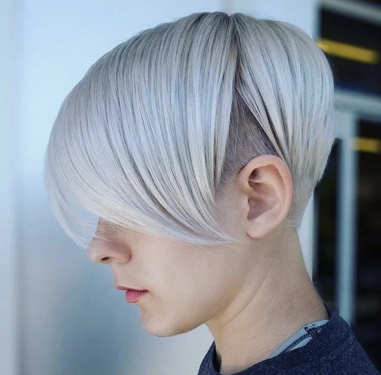 Піксі з косим чубчиком і поголеними скронями – розкішний варіант, який підійде, як жінкам з круглою, так і овальною формою обличчя. Універсальність це не все, чим цінується ця модель стрижки, вона плюс до всього ще й робить зовнішність стрункішою. Зверніть увагу, що подовжений філірований чубчик може приховати асиметрію обличчя, зайві сантиметри, а також недосконалості шкіри.