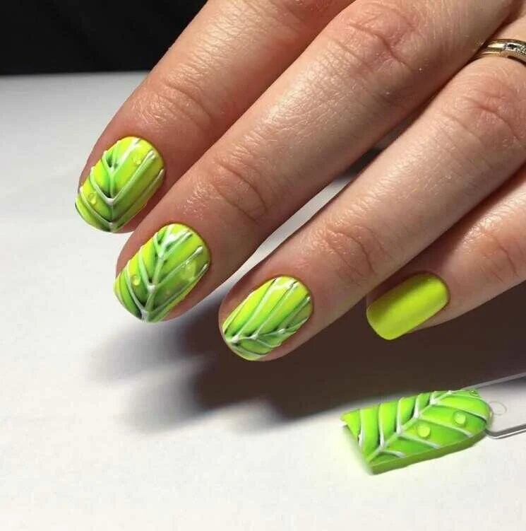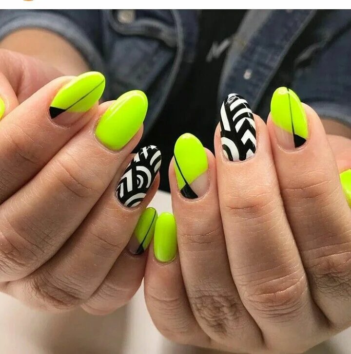 Ще один тренд – жовтий колір, що плавно перетікає в зелений або включає його в свій підтон. Як ми вже говорили раніше, з ним потрібно бути обережними. Оптимальним варіантом стане дизайн нігтів, де лаймово-жовтий йде в парі з більш спокійним відтінком або представлений зовсім невеликою порцією.