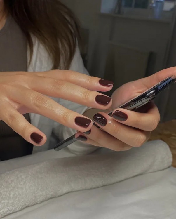 Смачний та насичений шоколад – манікюр, який виглядає дорого. Найкраще він буде дивитися на акуратних коротких нігтях, а поєднується з будь-яким одягом: від спортивного до строгих піджаків.