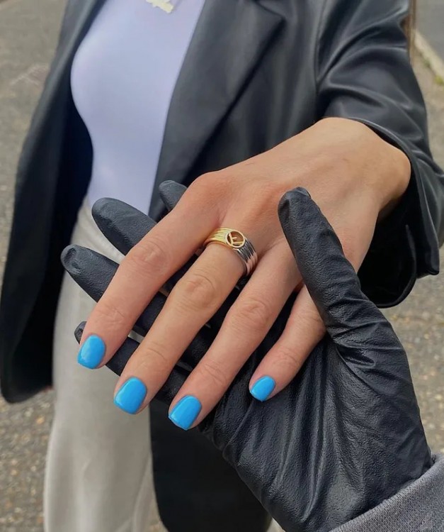 Манікюр з блакитним лаком – яскравий протест осінньої нудьги. Поки небо затягується сірими хмарами, на нігтях зберігається ясна погода. Колір дуже яскравий, але не кричить – те, що треба для офісу та вечірок.