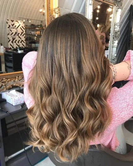Легке каліфорнійське мелірування золотисто-медовими пасмами виглядає тепло і дуже красиво на коричневому волоссі різного тону. Можна зробити більш часті “мазки” або обмежитися лише волоссям по низу.