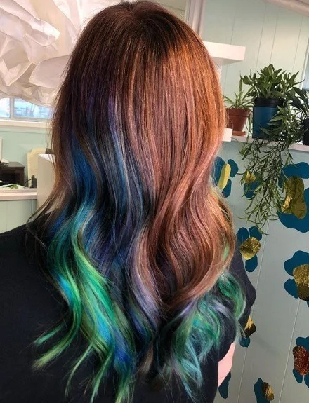Як вам таке незвичайне рішення? З усіх фантазійних стилів фарбування – це наймодніший на сьогодні. На волоссі немов веселка, яка яскраво висвітлюється сонцем.