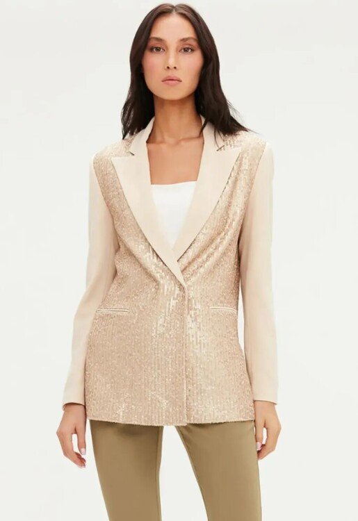 Ще один варіант, який стане чудовою основою для вечірнього образу – подовжений приталений жакет в паєтках. Він добре виглядає в тандемі з вініловими легінсами і взуттям на шпильці або в поєднанні з атласною спідницею в білизняному стилі і блискучими чобітьми. Ошатний жакет можна носити на голе тіло або поверх мереживного бралета, топа в стразах або прозорої водолазки. Щоб така річ органічно виглядала в повсякденних образах, її варто носити з більш стриманими речами. У цьому сенсі відмінно підійдуть чорні джинси, базовий топ і лаконічні шкіряні ботфорти – вийде стильний збалансований образ з родзинкою.