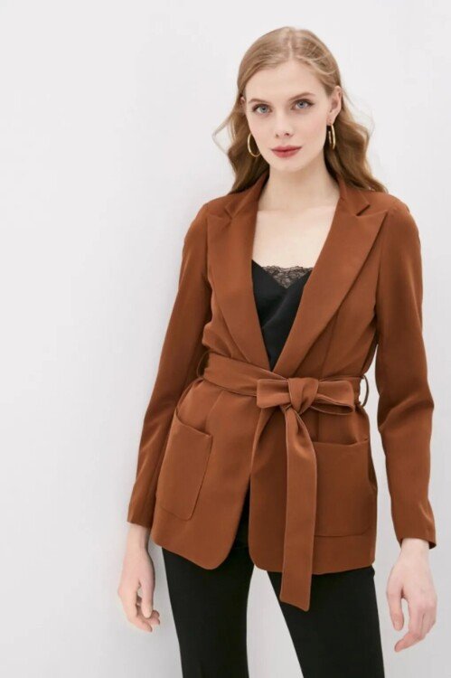 Альтернативою жакетам на блискавці і гудзиках стане модель на поясі. Такий жакет допоможе сформувати жіночний силует і підкреслить талію. Він органічно виглядає зі спідницею-олівцем, брюками-бананами, джинсами в вінтажному стилі, джинсами і брюками скінні. В якості бази під піджак можна використовувати водолазку, ажурний топ, базову сорочку, футболку або топ-локшину з високим горлом. Пояс при бажанні можна замінити на більш акцентний ремінь з гладкої або тисненої шкіри.