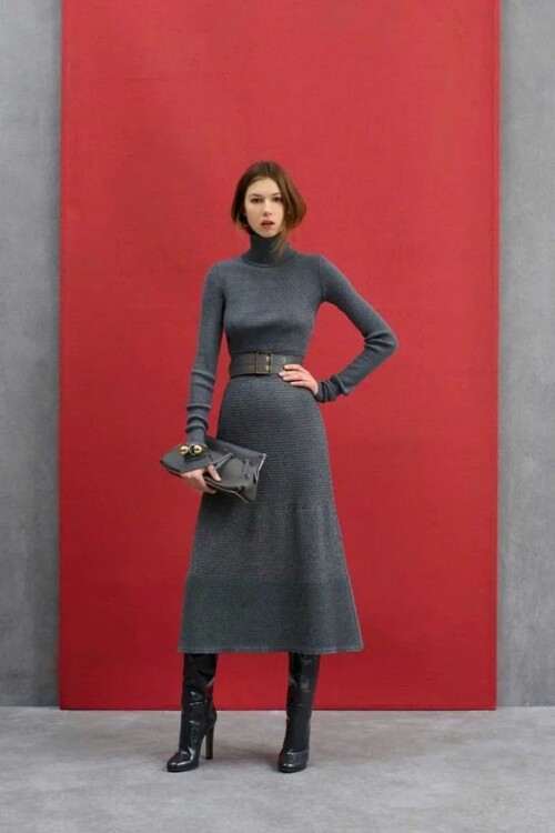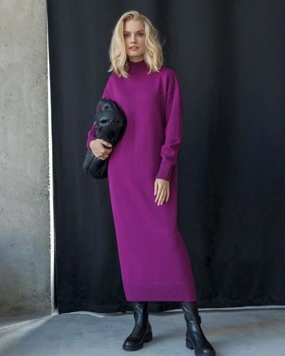 У холодну пору року особливою популярністю користуються трикотажні сукні. В тренді моделі середньої довжини. В якості декору тут використана фактурна в’язка і об’ємний малюнок.