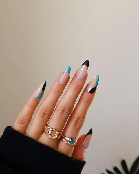 Френч, який виглядатиме дуже стильно на ваших руках. Вибирайте два улюблені кольори і доповніть їх золотими або срібними смужками. Додайте кільця у колір смужок, щоб образ виглядав завершеним!