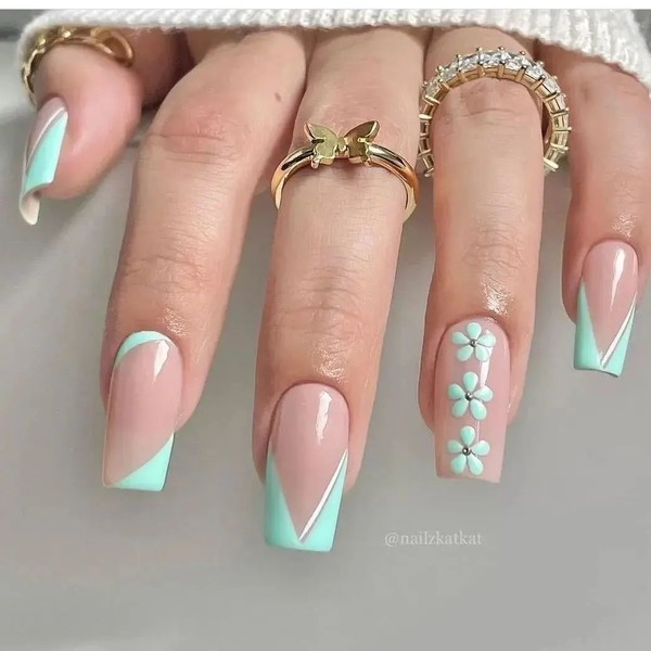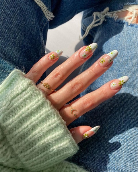 Дуже по-весняному виглядає такий манікюр. Спочатку намалюйте звичайний білий френч, а потіма зелені квіточки. На середину деяких ромашок можна наклеїти перлинку, щоб манікюр виглядав ніжніше.