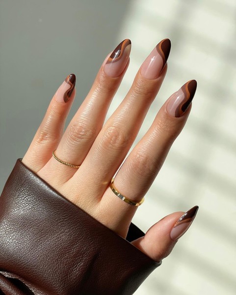 Френч хвилями виглядає стильно і цікавіше ніж класичний французький манікюр. Спробуйте виконати його у кавових тонах: вибирайте шоколадний, тауп та цегляно-оранжевий кольори. На кожному нігті намалюйте різний вигин ліній, щоб манікюр вийшов справді унікальним.