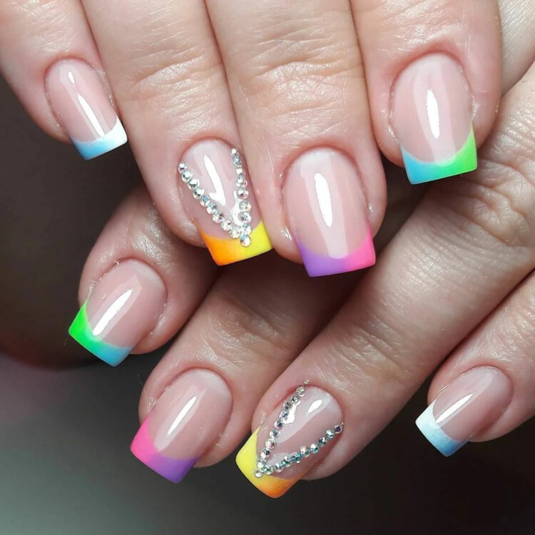 Влітку особливим попитом користується різнокольоровий френч. Хочете виділитися? Вперед! Кольоровий і яскравий френч в вашому розпорядженні. Можна додати кислотних відтінків або ж виконати манікюр із застосуванням ніжних пастельних кольорів. У будь-якому випадку з таким манікюром ви будете в центрі уваги.