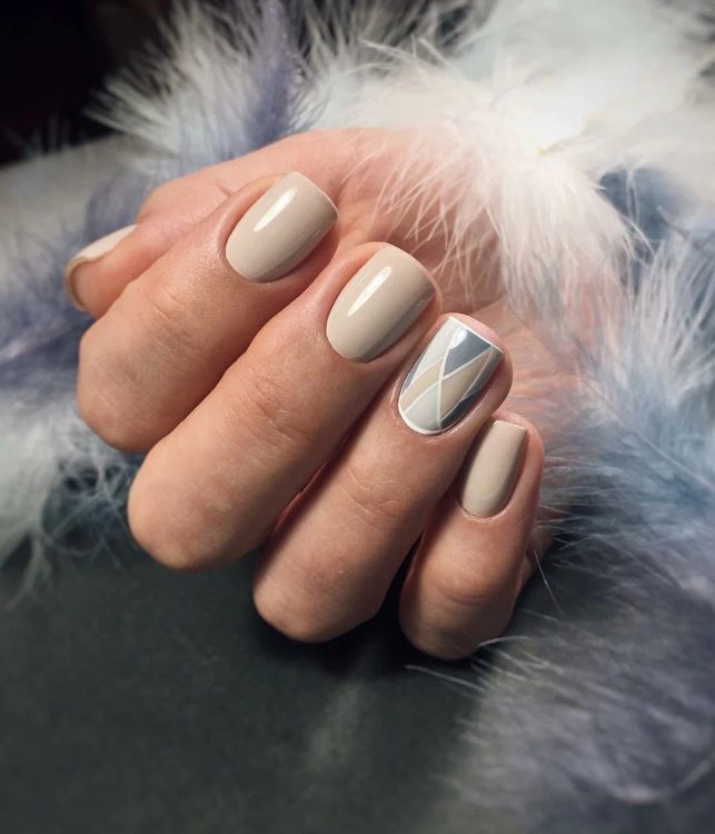 Молочна база + чітка та лаконічна геометрія, виконана за допомогою золотої чи срібної стрічки – швидкий та ефектний варіант манікюру, який підійде навіть для святкових заходів.
