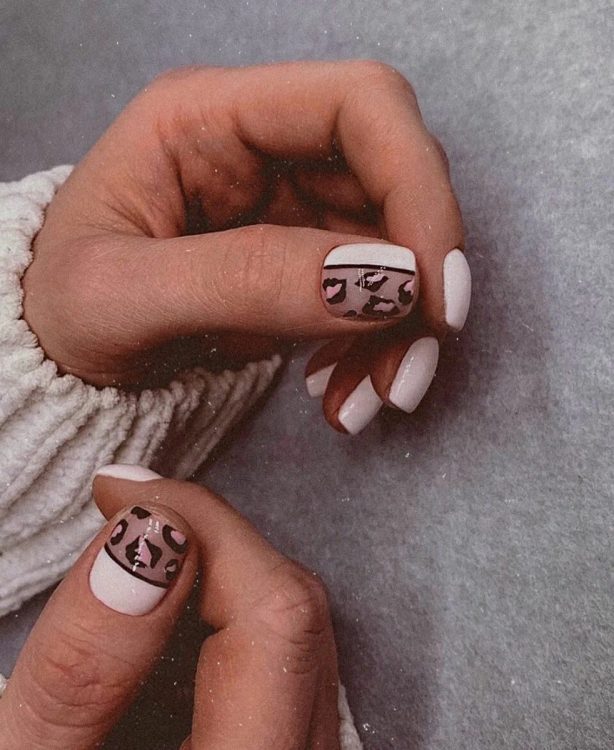 Біле покриття розмежуйте чорною смужкою, на одній із сторін намалюйте стильний леопардовий принт з яскравими вставками. У результаті вийде дуже модний та сучасний дизайн манікюру.