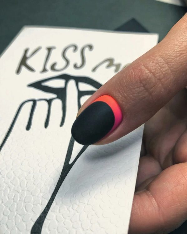 Місячний дизайн з неоновими фрагментами + темний фон + матовий топ – комбінація, гідна вашої уваги. Даного плану манікюр підійде як для холодного, так і для спекотного сезону. Не важливо, якої довжини будуть ваші нігті, в даному випадку цей дизайн виглядатиме доречно на будь-якій нігтьовій пластині.