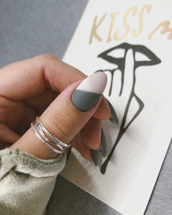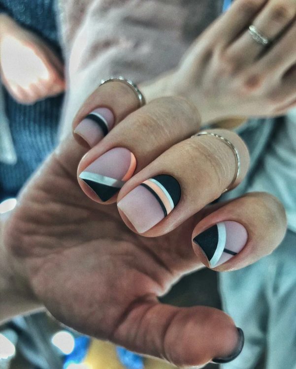 Наступний ніжний і привабливий варіант манікюру включає геометричне зображення, виконане в пастельних відтінках. Матовий топ додає родзинки манікюру із трендовим дизайном.