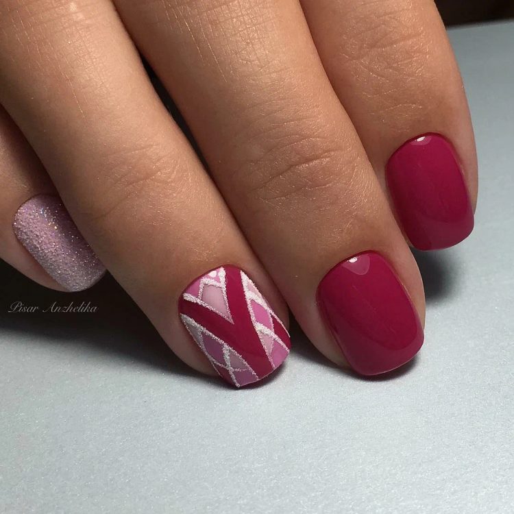 Зверніть увагу, що геометричний дизайн в манікюрі можна комбінувати з дрібними блискітками – це поєднання виглядає максимально яскраво і виразно.
