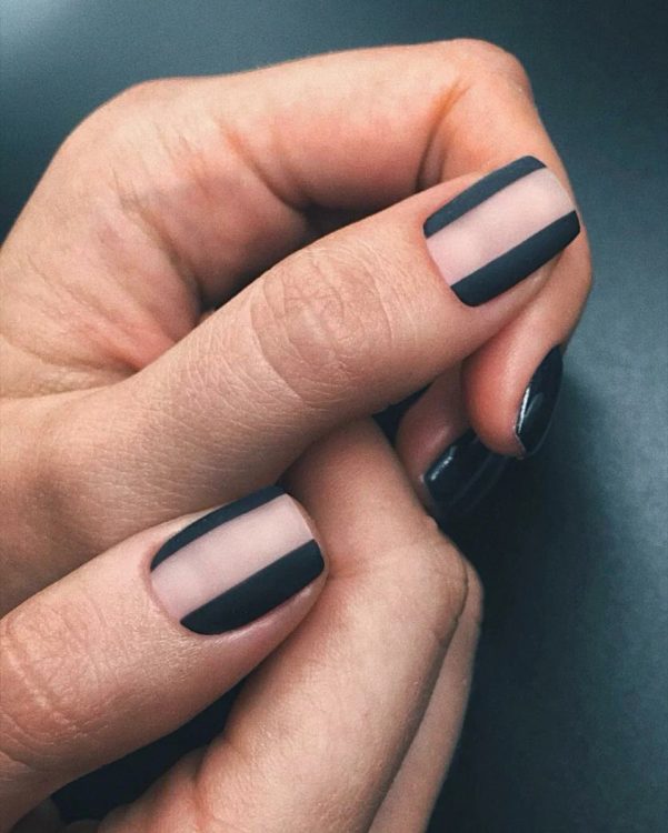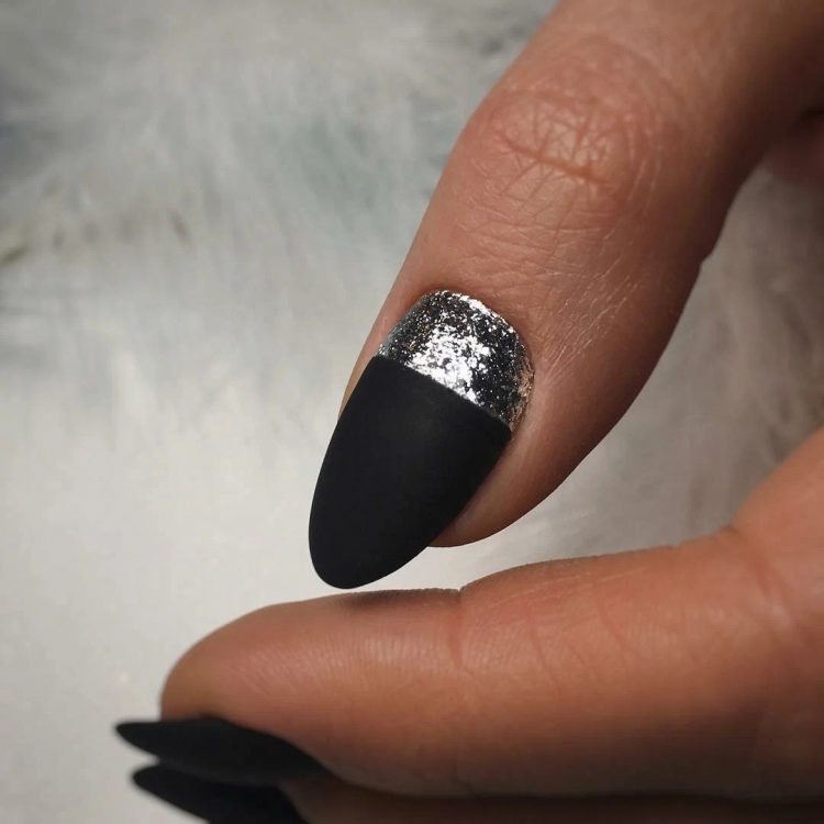 Чорне матове покриття + срібне чітке промальовування у вигляді геометричних фігур – манікюр, який обов’язково зверне на себе увагу.