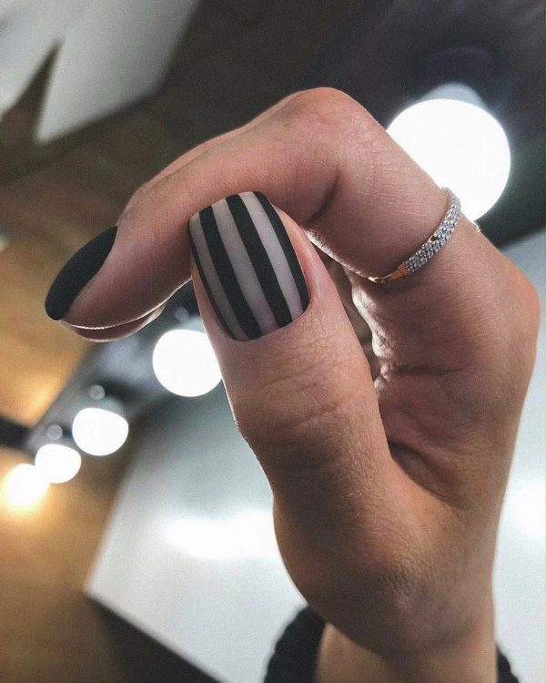 Суворе і чітке геометричне промальовування підходить як для довгих, так і коротких нігтів різної форми. В даному випадку чорні візерунки гармонійно перегукуються із темним однотонним покриттям, матовим топом та контрастними срібними вставками.