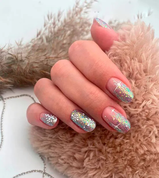 Манікюр із сріблястими блискітками та сніжинками на овальних нігтях
