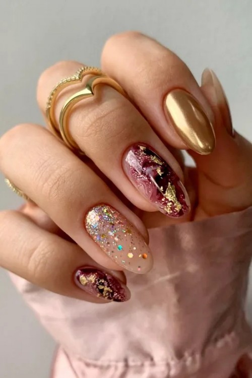 Ідеальний золотий манікюр з блискітками на овальних нігтях