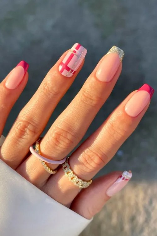 Рожевий манікюр з блискітками та стразами на квадратних нігтях