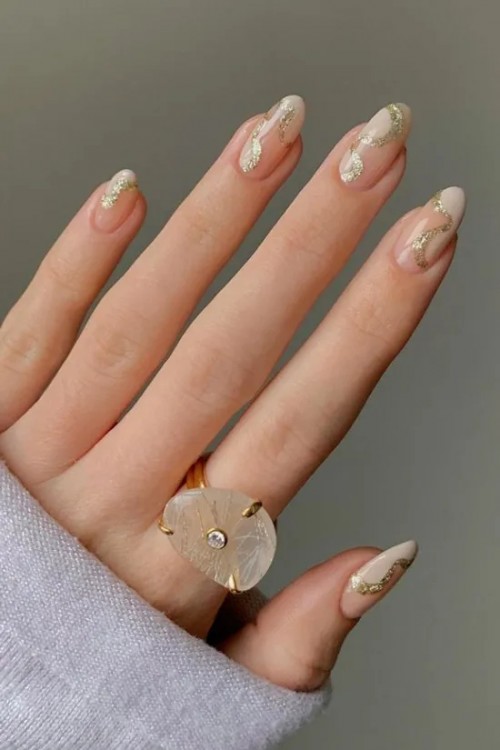 Бежевий манікюр із золотими лініями на овальних нігтях