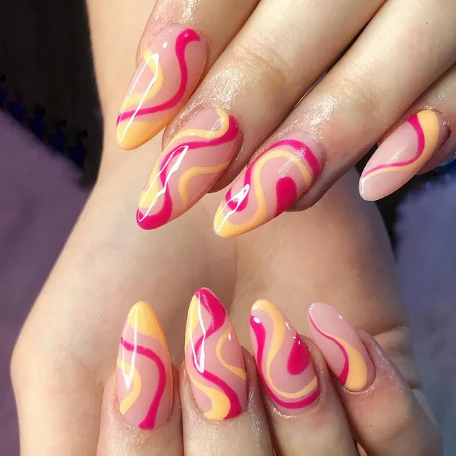 Різнокольорові хвилі, у стилі ретро-принтів із 1970-х, ще влітку захопили інстаграм. Їх легко повторить навіть новачок у нейл-дизайні: адже чим хаотичніше розташовані лінії, тим цікавіше буде виглядати результат. І не забувайте про бонус, що подарує такий манікюр: вертикальні хвилі візуально подовжують нігті. А це завжди доречно!