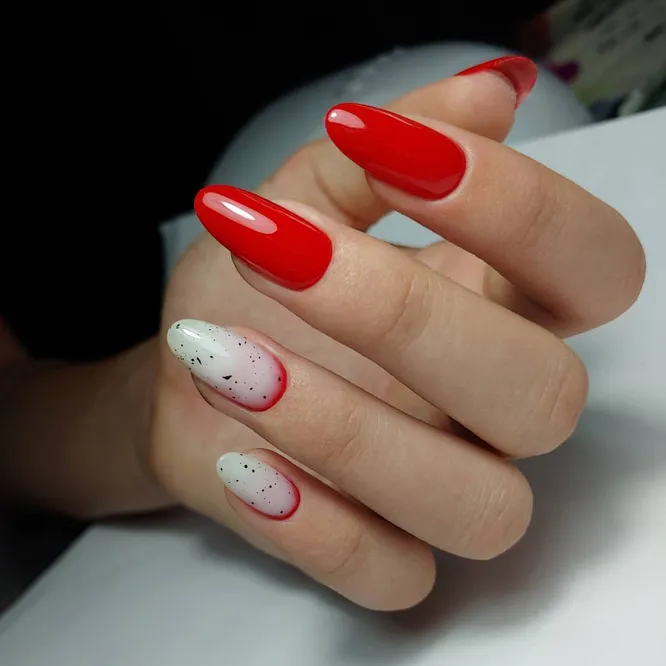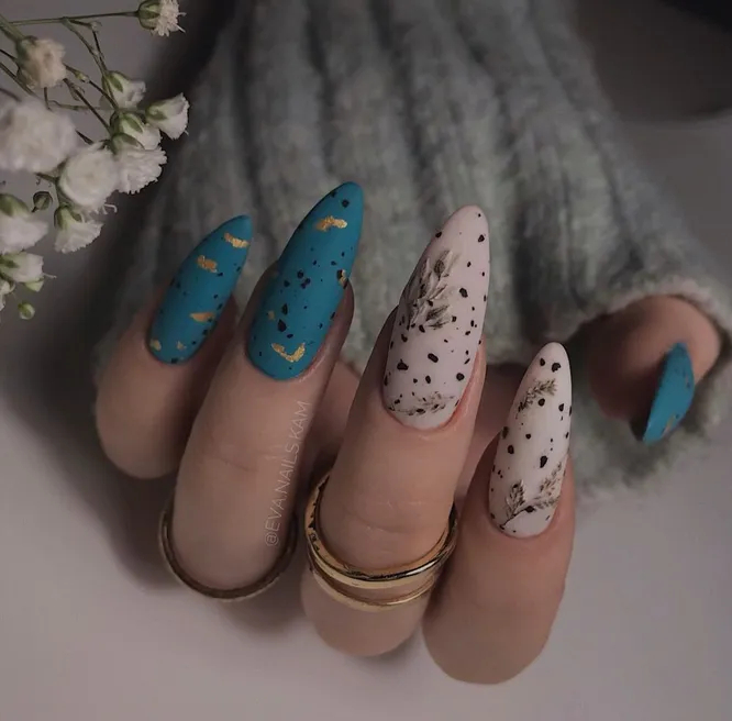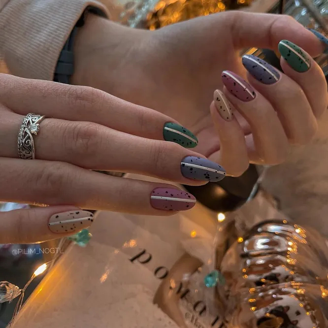 Ще один головний тренд останніх сезонів – хаотичні цятки на нігтях, що нагадують забарвлення перепелиних яєць. Таким дизайном можна прикрасити пару акцентних нігтиків або одразу всі десять пальців. Або, навіть, поєднати його з іншими деталями — мінімалістичність цяток це дозволяє!
