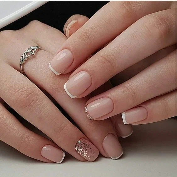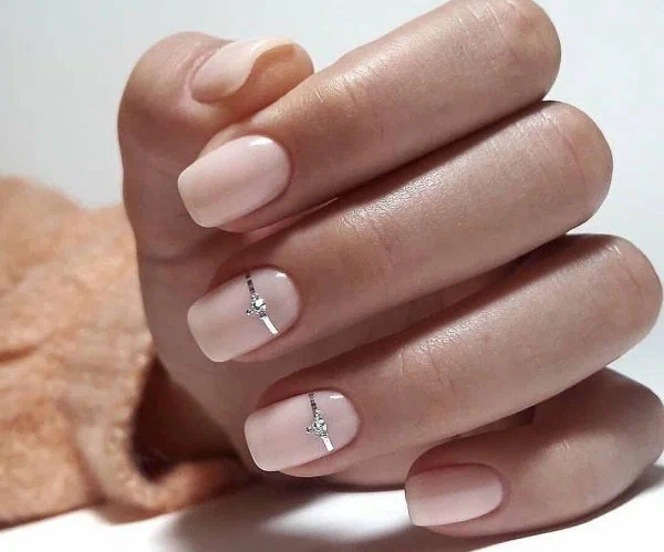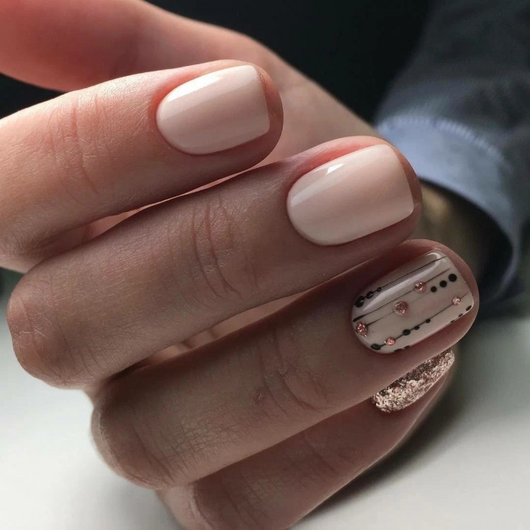 Тілесні відтінки з блискучим декором для коротких нігтів