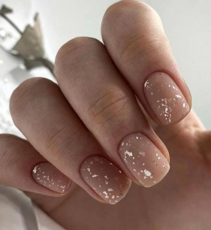 Нюдове покриття – невичерпна основа для стильних експериментів. Тим не менше, найбільш гармонійно ніжний відтінок поєднується з блискітками.