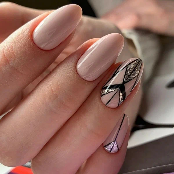 Базове нюдове покриття дозволяє розкрити стилістику будь-якого декоративного дизайну повною мірою. Прихильники традиційних поглядів та сучасні бізнес-леді найчастіше прикрашають тілесну основу нігтьової пластини чіткими лініями та геометричними фігурами, що виглядають актуально але, водночас, лаконічно.