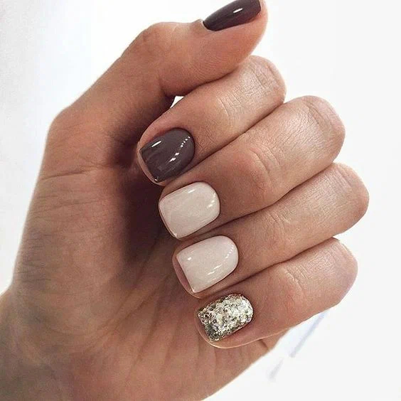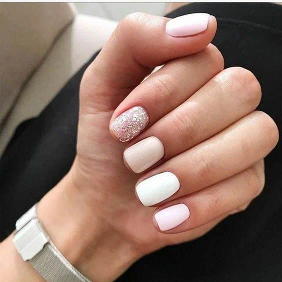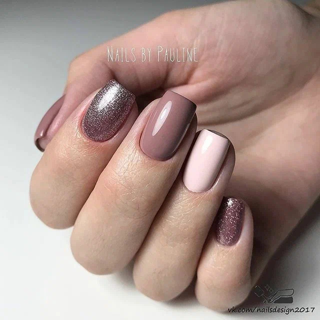 Нейл майстри радять не зупинятися лише на одному відтінку у манікюрі. Щоб нігті виглядали незвично і сучасно, можна вибрати відразу кілька близьких по відтінку гель-лаку і урізноманітнити їх блискітками.