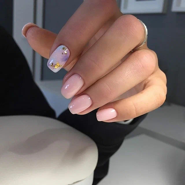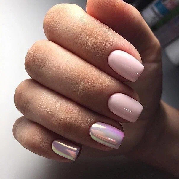 Перший манікюр включає пастельну колірну гаму. Ефектності дизайну додав блискучий гель-лак у відтінку “рожеве золото”.