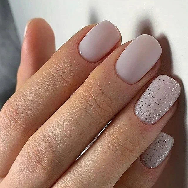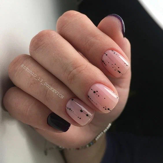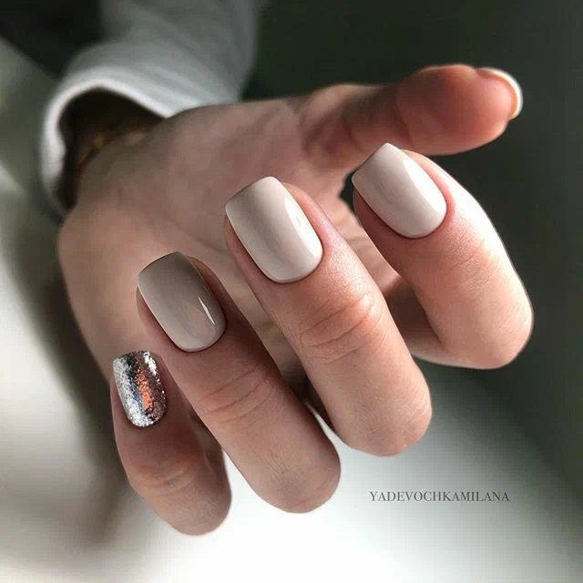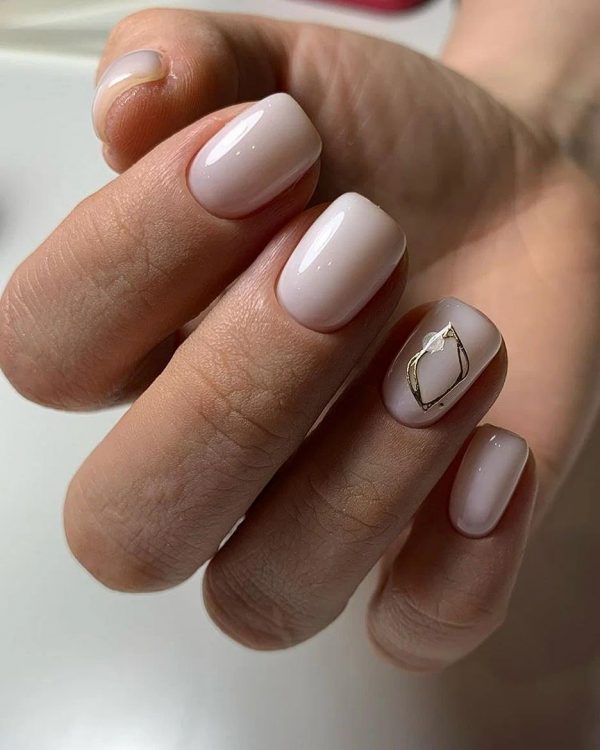 Також нейл майстри пропонують урізноманітнити мінімалістичний манікюр універсального нюдового відтінку лаконічною геометрією на одному з нігтів. Щоб манікюр не займав багато вашого часу в дизайні, завжди можна використовувати наклейки або ж скористатися стемпінгом.