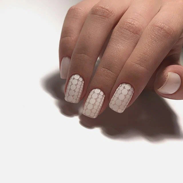 Нюдовий гель-лак + геометричні візерунки – модне та сучасне поєднання, яке виглядає максимально благородно та універсально. Завершує сучасний манікюр матовий топ.
