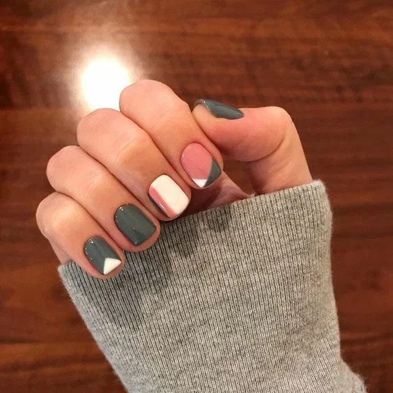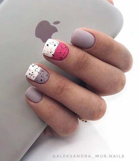Пастельний сірий + матовий топ + геометрія з рожевими акцентами + дизайн “перепелине яйце” – ідеальний манікюр для коротких нігтів квадратної форми.